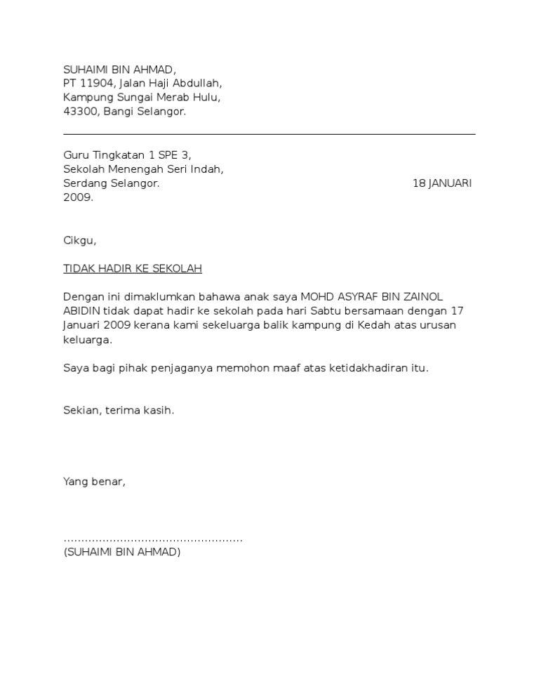 Contoh Surat Tidak Hadir ke Sekolah 2 Sebab Balik Kampung Ahmad Khalid 1103 B Lorong Alor Akar 33 25250 Kuantan Pahang. Surat rasmi ketidakhadiran ke sekolah atas pelbagai alasan. Agar meyakinkan sang anak bisa meminta orang tua untuk menuliskan suratnya atau bisa juga dengan mencantumkan tanda tangan orang tua pada surat tersebut.